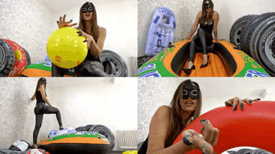 Madame Marissa has been quite in a mood lately and to let out all the pent-up pressure she bought inflatable toys. Today, she has worn her favorite red bottom stiletto heels to help her with the job. Many of the toys are huge. Her sharp heels pierce the toys one by one. By the time she is done stepping on and pocking holes with her heels, most of the toys are destroyed. She also realizes that she feels a little bit better after the exercise.